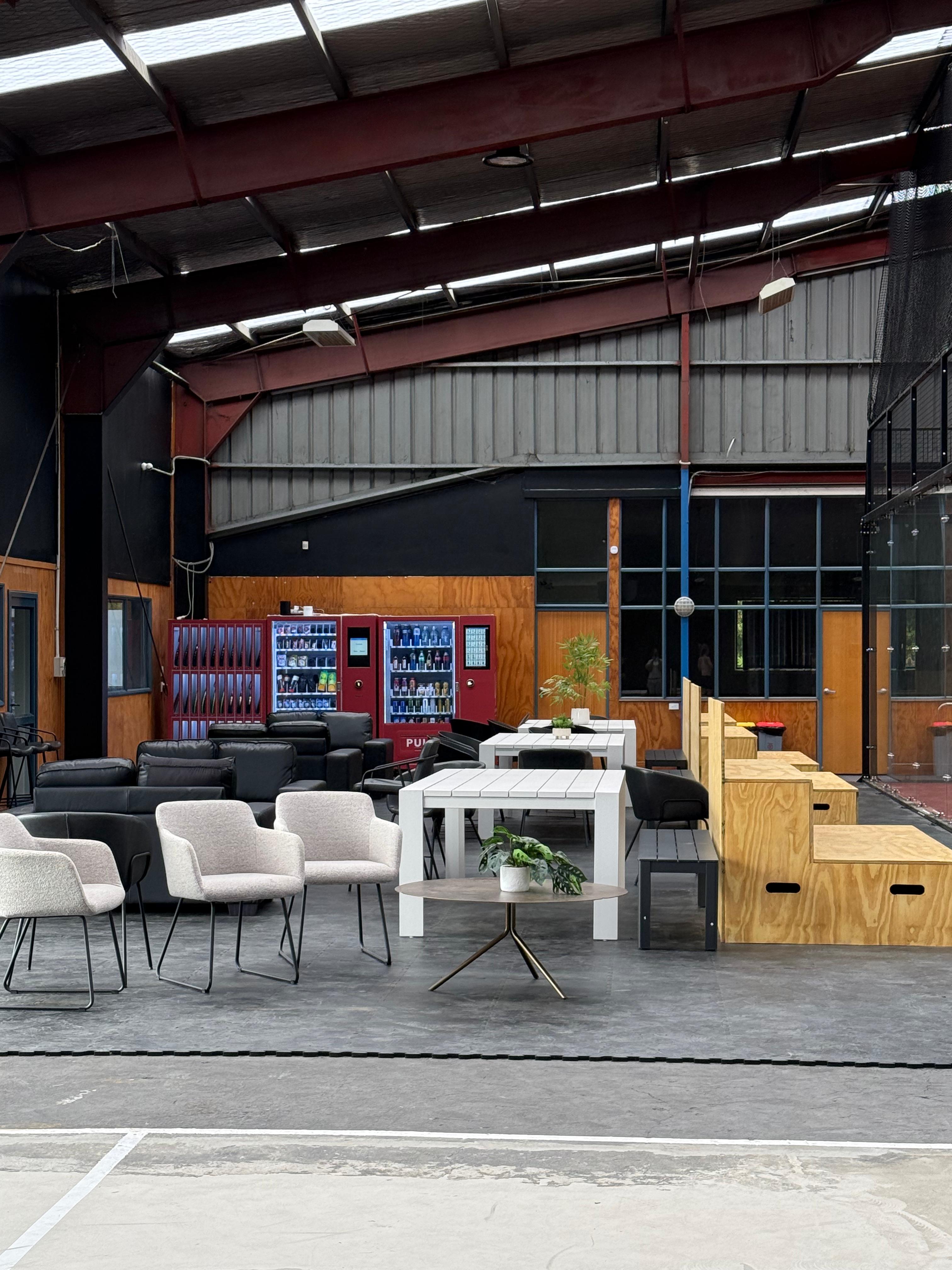 — Industrial-club feel with maroon accents, pressed plywood finishes, bright lighting, and greenery.